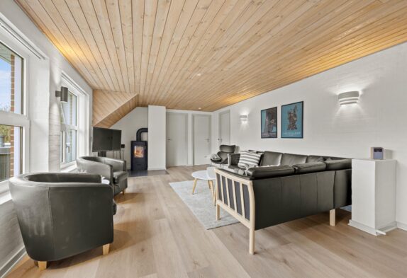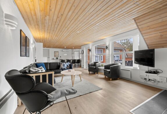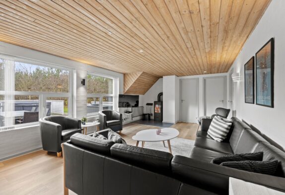 I det flotte skov- og klitområde i Henneby venter jer dette hyggelige sommerhus: Her har I mulighed for at holde en dejlig, afslappende ferie, hvor I kan nyde et veludstyret aktivitetsrum, sauna og udespa.