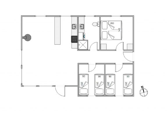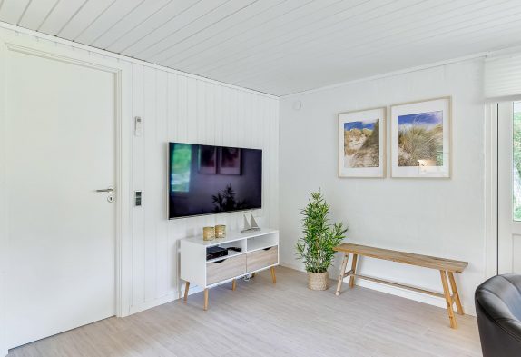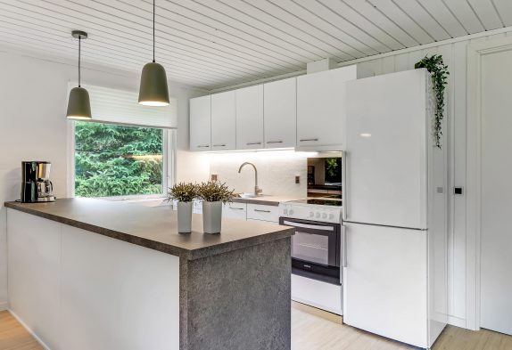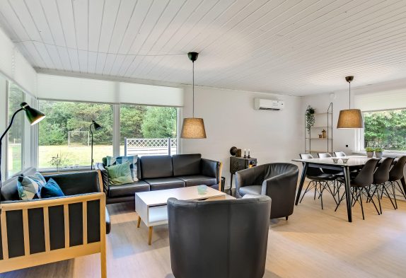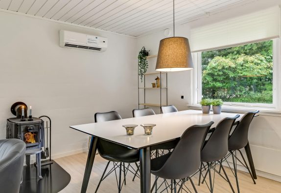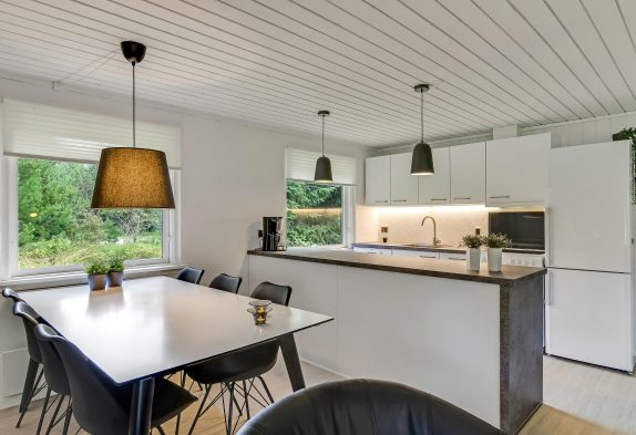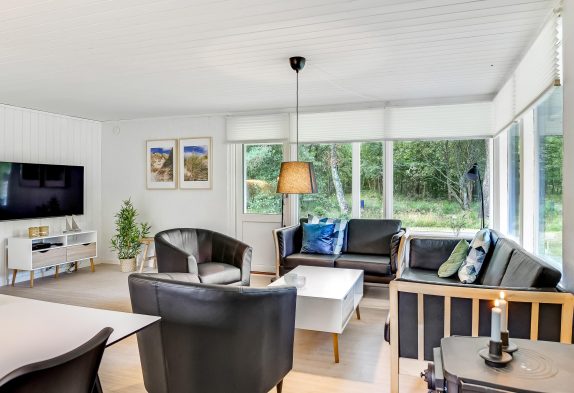 Indenfor venter jer en kombineret stue- og spiseafdeling med integreret køkken – smagfuldt indrettet i sort-hvide toner og med masser af komfort, der fuldender den afslappende sommerhusferie. På den moderne lædersofa er der lagt op til hyggelige filmaftener og læsning foran den knitrende brændeovn.