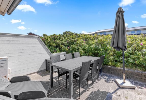 Fra sofaområdet er det muligt at gå direkte ud på den sydvestvendte terrasse, hvor du kan sidde og nyde solen eller sidde ude og spise i det gode vejr.