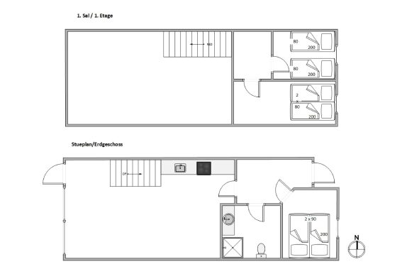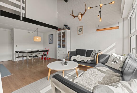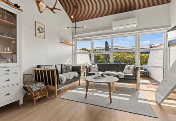 Lejligheden er fordelt på to etager, hvor du på første sal finder to soverum med en køjeseng og to enkeltsenge. Stueetagen byder på et lækkert soveværelse med en dobbeltseng og et dejligt lyst badeværelse. Derudover finder du det lækre og imødekommende køkken og stuen, som byder op til afslapning.