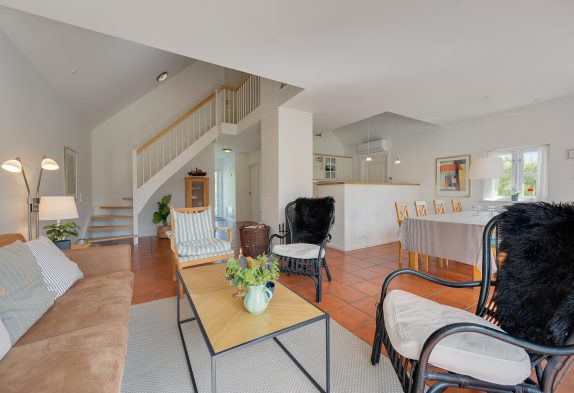 I stueetagen finder i også et soveværelse og et rummeligt badeværelse med gulvvarme. På første sal er to soverum med dobbelsenge og et gæstetoilet placeret.