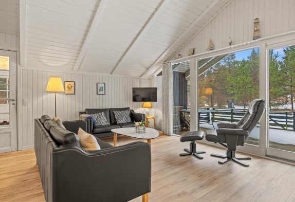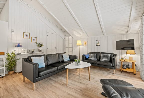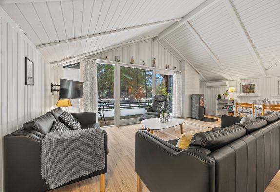 Opholdsstuen er husets hjerte og det sted, der bliver centrum for samvær og hyggelige øjeblikke. Det lyse og veludstyrede køkken med opvaskemaskine og stort kølefryseskab er forbundet med både stuen og spiseafdelingen, som udstråler helt klassisk og charmerende sommerhusstil med sine hvide træbjælker og lyse loft og vægge. Sofagruppen og de to lænestole indbyder til hyggelige filmaftener foran brændeovnen.