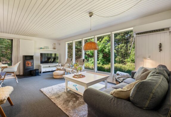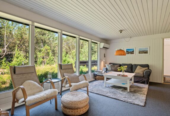De store stuevinduer, der følger hele stuens længde åbner op for et dejligt blik ud på lyng og nåletræer.