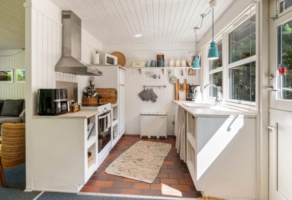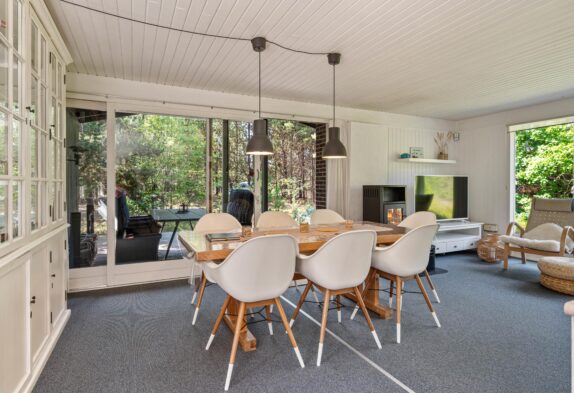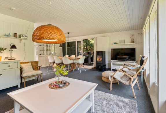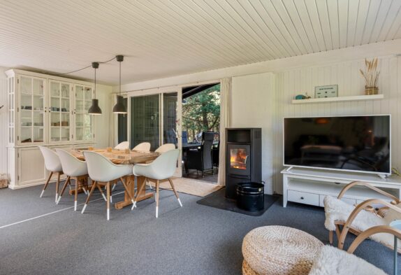 I det lyse åbne køkken finder I alt til tilberedelsen af lækre måltider, og imens opvaskemaskinen klarer resten, kan familien samles til lange sjove spilleaftener ved det store spisebord. For den perfekte stemning, kan der tændes op i den store brændeovn, der er centralt placeret i stue-alrummet.