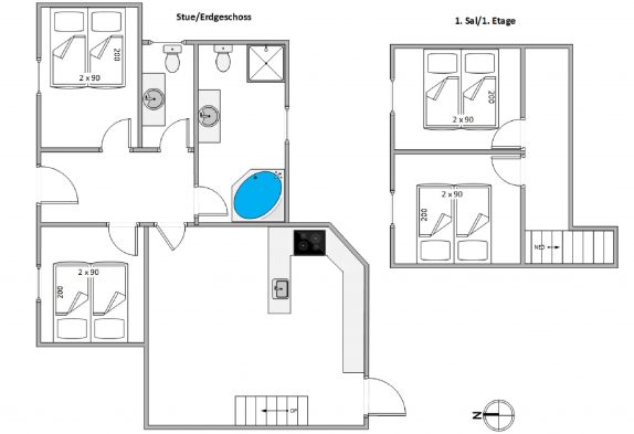| Dette moderne rækkehus på Fyrvej 26 rummer plads til 8 personer og er helt ideelt til to familier, der gerne vil planlægge ferie sammen. Spabadet er et af husets highlights, og her kan I forkæle jer selv lidt ekstra- Moderne indretning og spabadHusets indretning er både lys og moderne, og fra første øjeblik vil I med garanti føle jer godt tilpas. Der er også installeret et solenergianlæg og en varmepumpe i huset til at mindske strømforbruget. I stueetagen finder I det åbne køkken, som ligger i forbindelse med stuen, to af de i alt fire soveværelser, et badeværelse og et toilet. Det ene badeværelse er udstyret med et lækkert spabad, hvor I kan slappe af og smide fødderne opad efter en lang gåtur ved stranden. I det samme badeværelse finder I også vaskemaskinen og tørretumbleren, som er ekstra praktisk, hvis I kommer med små børn. På øverste etage befinder de to sidste soveværelser sig. Kun et stenkast fra den skønne strandDen skønne sandstrand i Blåvand ligger kun 400 meter fra huset og kan hurtigt nås til fods, uden at der skal findes en parkeringsplads til bilen. Her er der noget for hele familien. Sam muslinger og sten, bad i bølgerne eller tag strandhåndklæderne med og slap af i solen, mens børnene leger i den kæmpemæssige sandkasse. Også Blåvands centrum er inden for rækkevidde. Her kan I handle ind, ose i tøjforretninger og købe souvenirs til de hjemmeblevne. I Blåvand finder I også en lille zoo, som helt sikkert vil falde i god jord hos de mindste feriegæster, og en udflugt til bunkermuseet Tirpitz kan bestemt anbefales. Læs mere om ferielejlighed 8 personer |