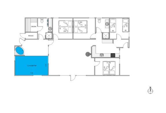 Der er i alt 4 soveværelser, hvoraf 3 er med dobbeltsenge og 1 med 2 enkeltsenge. Der er 2 badeværelser i sommerhuset, hvoraf den ene er i forlængelse med pool afdelingen.