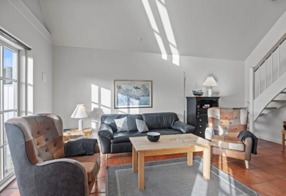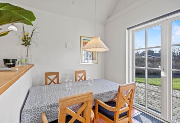 Det cremefarvede rækkehus står hyggeligt og indbydende i Blåvands skønne ferieomgivelser, og her er der ingen tvivl om, at I kan få nogle rigtig dejlige feriedage langt væk fra alting – uden at mangle stil og luksus.