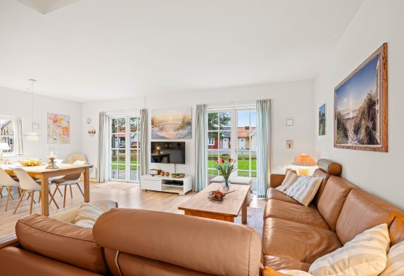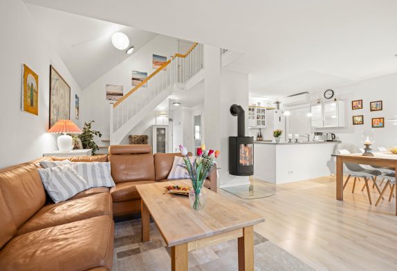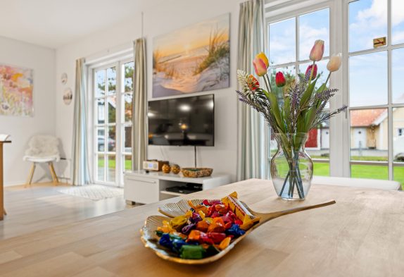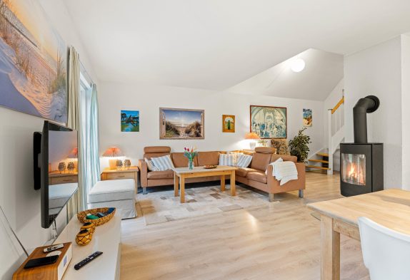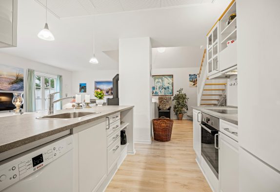 I det kombinerede køkken- og opholdsrum er der god plads til at slappe af i sofahjørnet med en god bog eller en spændende film i fjernsynet og med brændeovnens knitrende flammer i baggrunden bliver ferien kun ekstra god. Køkkenet har i 2025 gennemgået en lettere renovering med bl.a. en anden bordplade.
