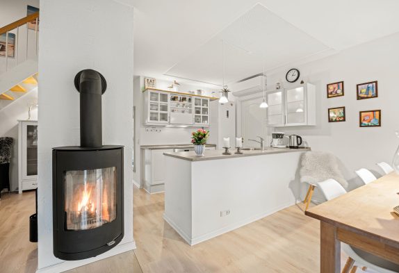 Køkkenet har i 2025 gennemgået en større renovering med bl.a. nyt køleskab, ovn og opvaskemaskine, og der er indbygget ny induktionskogeplade i den nye bordplade.