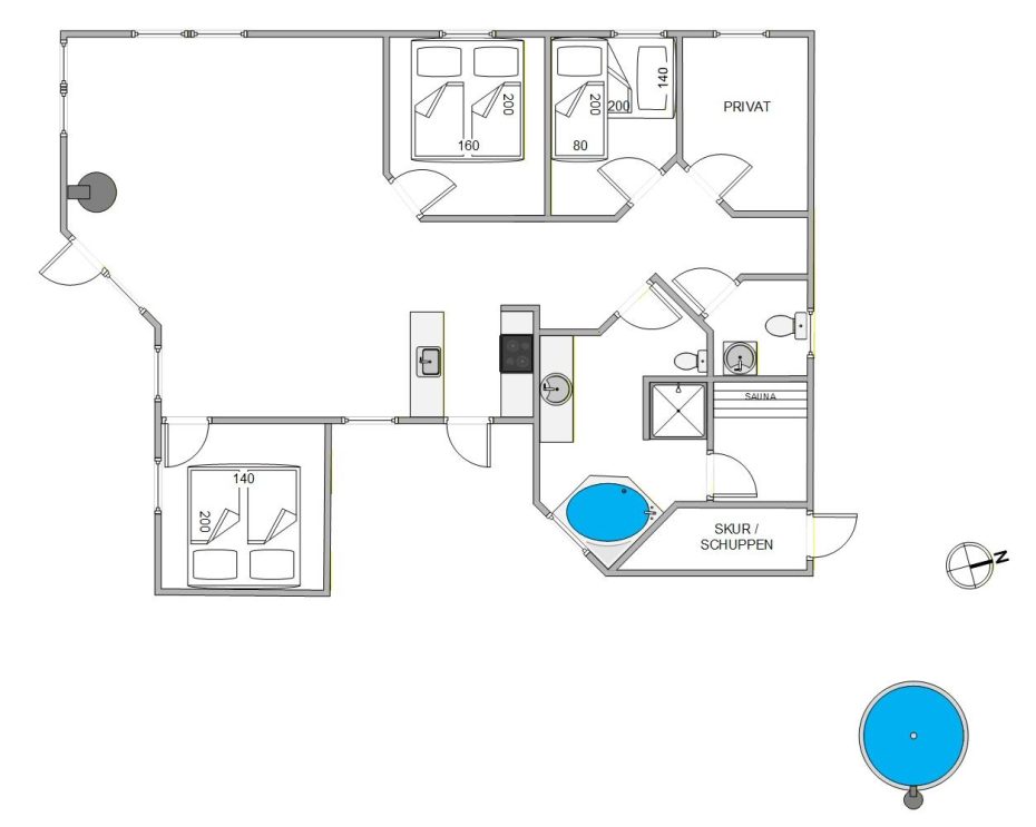 På feriehusets 90 kvadratmeter finder I 3 gode soveværelser, som I kan få jeres skønhedssøvn i på ferien. 2 af soveværelserne er indrettet med en dobbeltseng hver, den ene 140 bred og den anden 160, og det tredje soveværelse er indrettet med en 140×200 seng, som over fodenden har en køje, der er 80 centimeter bred. Om morgenen skal I ikke bekymre jer om kø til toilettet, for her er der både et badeværelse og et gæstetoilet.