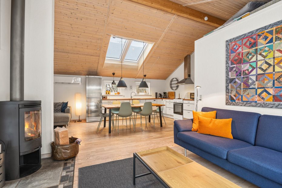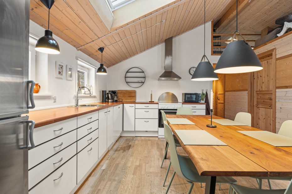 Køkken, stue og spiseplads er samlet i ét stort opholdsrum, hvor I alle kan nyde hinandens selskab, mens I hver især laver noget forskelligt.