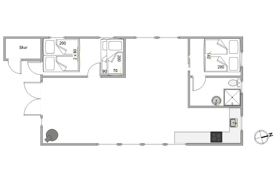 Sommerhuset, som gennemgik en stor renovering i 2023, er 64 m2 fordelt på blandt andet 2 værelser, hvoraf det ene er indrettet med dobbeltseng, og det andet med både dobbeltseng og en enkeltseng. Det er oplagt til børnefamilien, eller hvis I er et vennepar, der gerne holder ferie sammen.