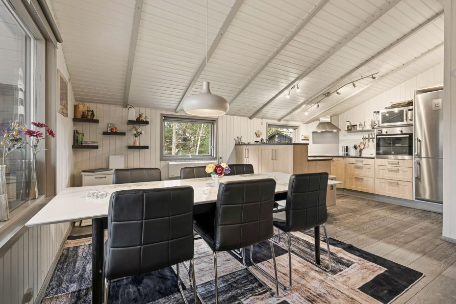 Sommerhusets hjerte er det lyse og hyggelige alrum, hvor I helt sikkert kommer til at tilbringe mange dejlige stunder i løbet af jeres ferie. Her er køkken, stue og spiseplads forenet, og der er derfor mange muligheder for, hvad I kan lave sammen her. I køkkenet er der endda en opvaskemaskine, så I slipper for at tage opvasken efter madlavningen.
