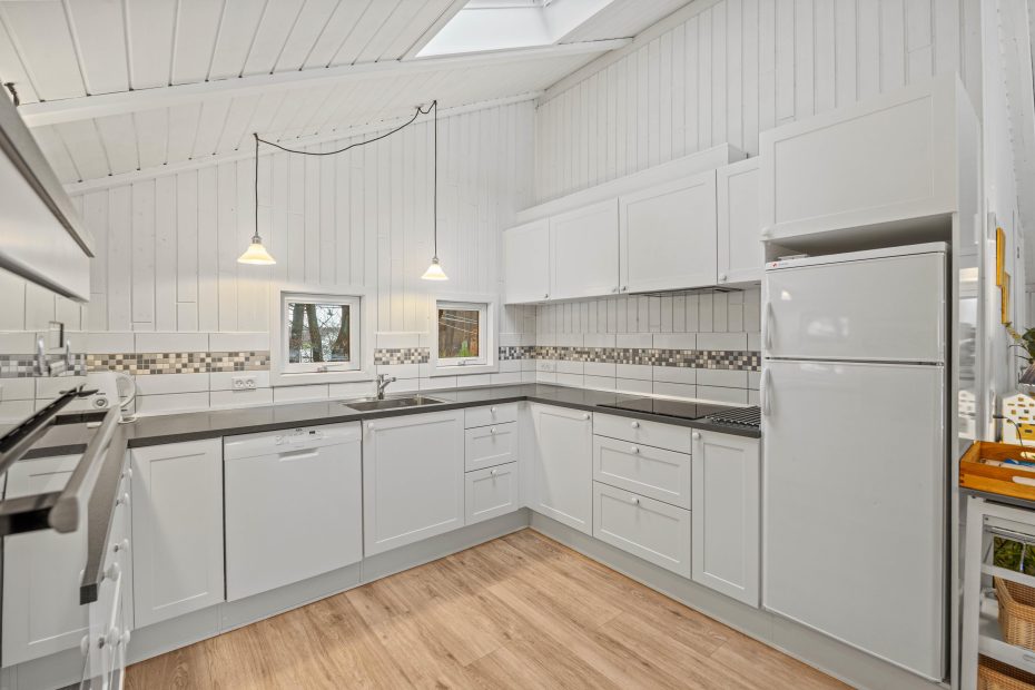 Opholdsstuen er husets hjerte og det sted, der bliver centrum for samvær og hyggelige øjeblikke. Det lyse og veludstyrede køkken med opvaskemaskine og stort kølefryseskab er forbundet med både stuen og spiseafdelingen, som udstråler helt klassisk og charmerende sommerhusstil med sine hvide træbjælker og lyse loft og vægge. Sofagruppen og de to lænestole indbyder til hyggelige filmaftener foran brændeovnen.