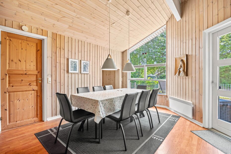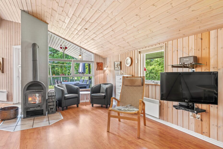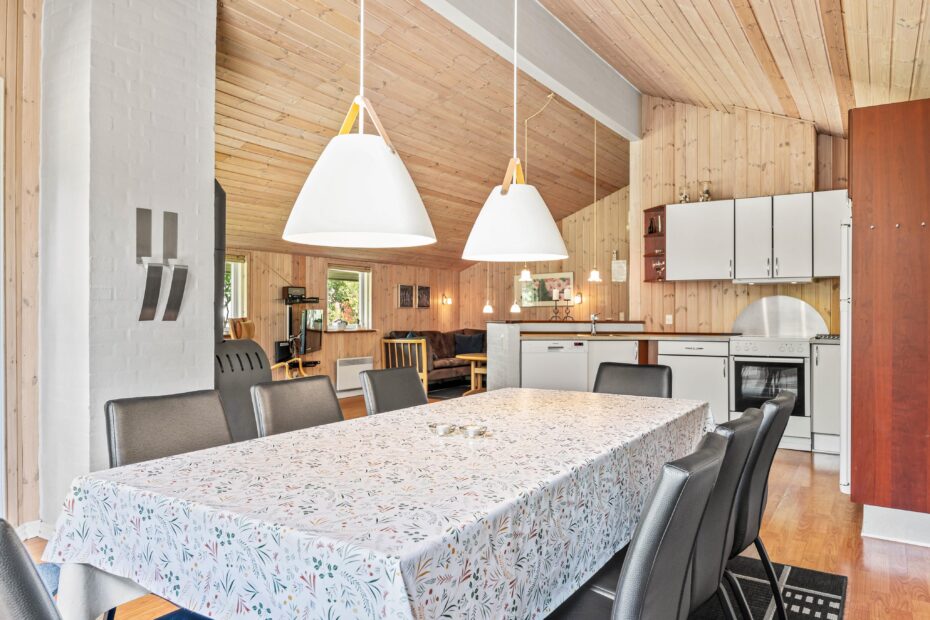 Indendørs i dette hyggelige sommerhus venter jer en behagelig oase af komfort og bekvemmelighed. Køkkenalrummet, med sin åbne planløsning og udsyn ud over stuen, danner et indbydende centrum for familiens samvær. Her gør en praktisk opvaskemaskine ferierengøringen til en leg, mens det lyse og luftige rum med højt til loftet skaber en rummelig atmosfære.