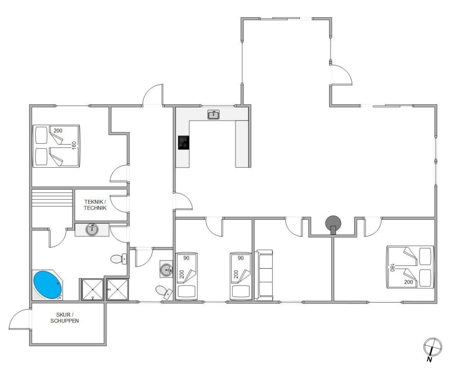 Brændeovn, fladskærms-tv, parabol (danske og tyske kanaler), dvd, radio m/cd-afspiller.