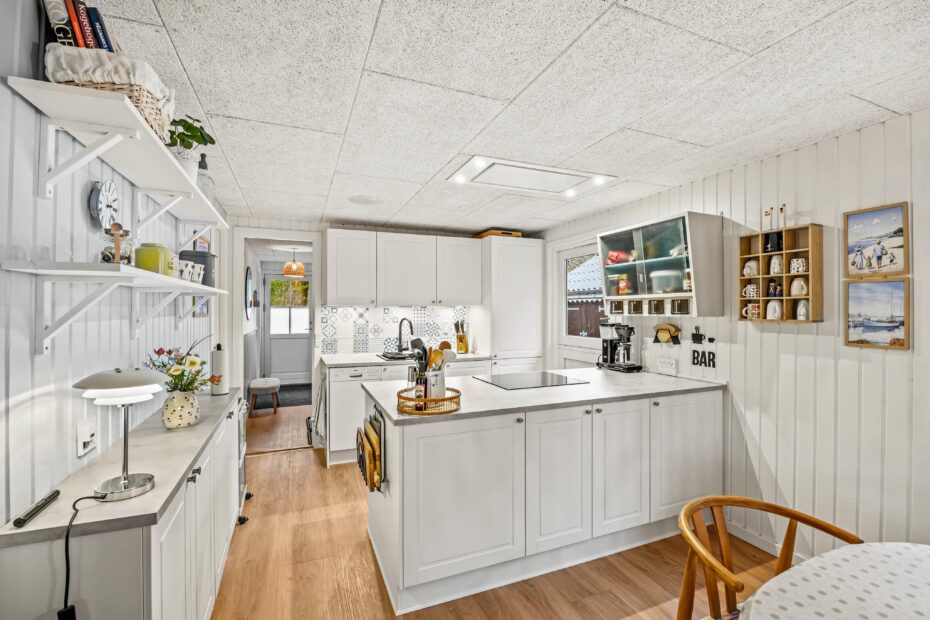 Det dejlige sommerhus er renoveret i 2021, og har en skøn moderne indretning med masser af lys. Spiseafdeling, stue og køkken er kombineret, hvilket uden tvivl vil blive jeres samlingspunkt på ferien. Her kan I også nyde hinandens selskab foran feriehusets brændeovn med et godt glas vin.