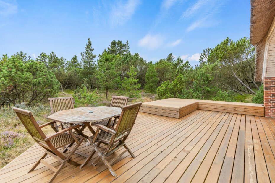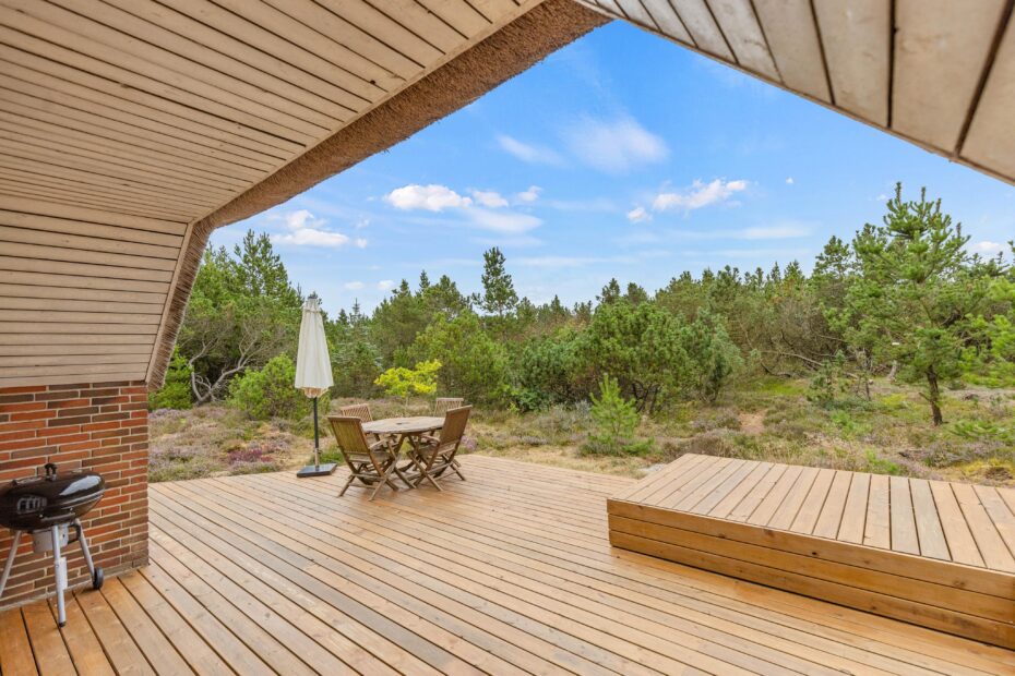 Fra stuen kan I træde ud på den åbne og delvist afskærmede terrasse, der er ideel til en aften under åben himmel. Terrassen er veludstyret med både grill og havemøbler, så I kan nyde udendørs madlavning og afslapning. I finder også solvogne og en parasol til de solrige dage, hvilket gør terrassen til det perfekte sted at dase og nyde solen.