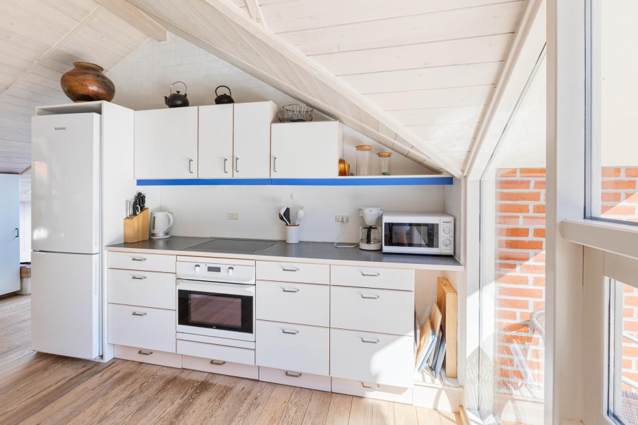 Når I træder ind i huset, kommer I til det åbne køkken- og stueområde, som med sikkerhed bliver feriens centrum og mødested. I køkkenet kan I tilberede dagens måltider sammen og diskutere de næste par dages ferieplaner, og efter aftensmaden klarer opvaskemaskinen arbejdet for jer. Imens kan I sætte jer godt til rette i sofaen og lytte til brændeovnens knitren, mens I slapper af med en god bog eller surfer på nettet.