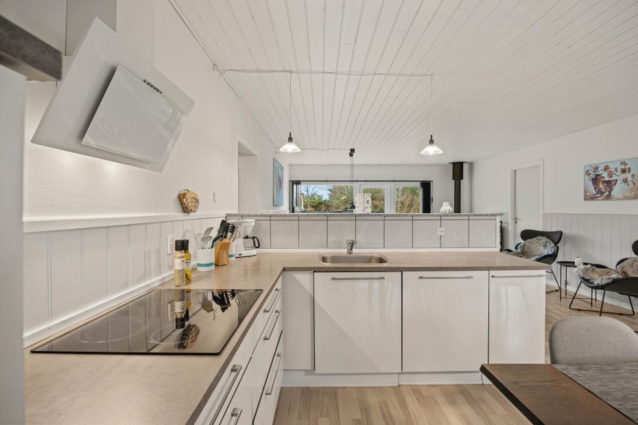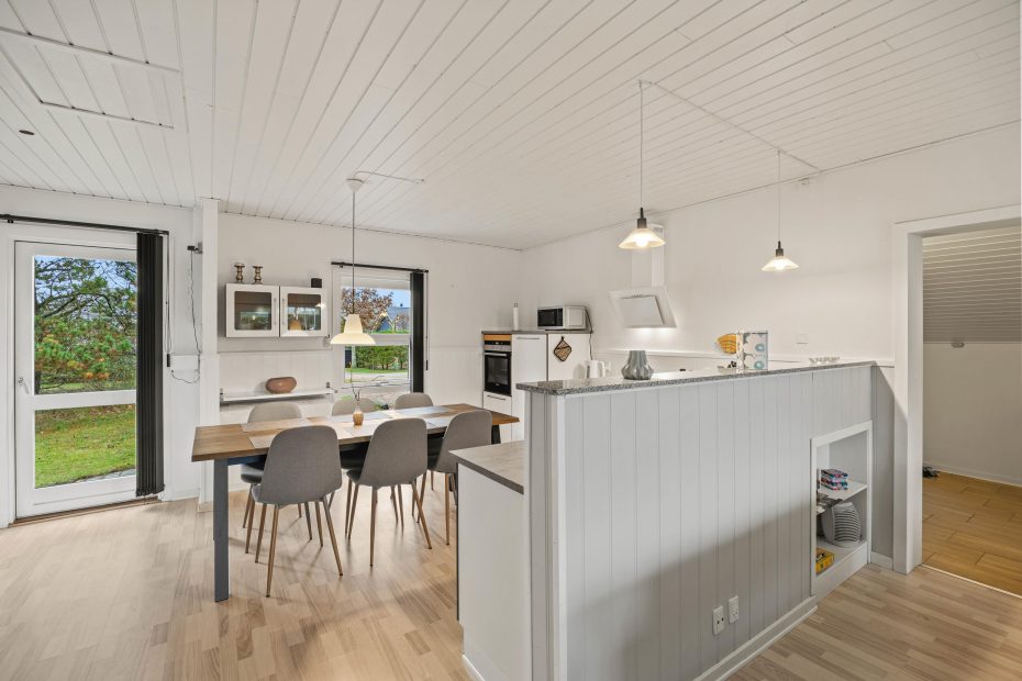 Det er nemt at se, at det rummelige sommerhus på Vestervang 1 i 2020 har gennemgået en omfattende renovering. Feriehuset fremstår lyst og indbydende med moderne og komfortabelt interiør, der skaber fine kontraster i indretningen.