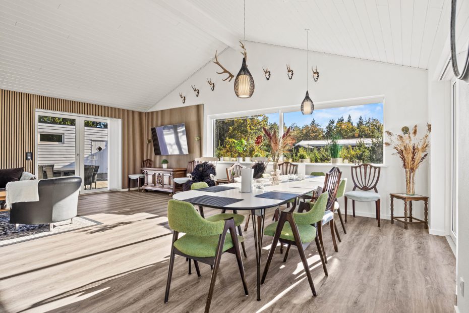 Sommerhuset i Houstrup imponerer med sin smagfulde indretning, hvor intet er overladt til tilfældighederne. Sommerhusets hjerte er den åbne opholdsstue med højt til loftet og store vinduespartier, som lukker masser af naturligt lys ind. Her kan I nyde rolige aftener foran fjernsynet eller lytte til jeres yndlingsmusik via Bluetooth-højttaleren. Den energibesparende varmepumpe sørger for den perfekte temperatur og et behageligt indeklima året rundt.