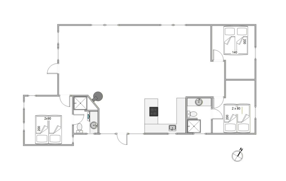 Sommerhuset, der blev renoveret i 2017, har tre værelser med hver en dobbeltseng. 2 værelser har eget badeværelse med gulvvarme, så der bliver ikke kø til toilettet eller morgenbadet.
