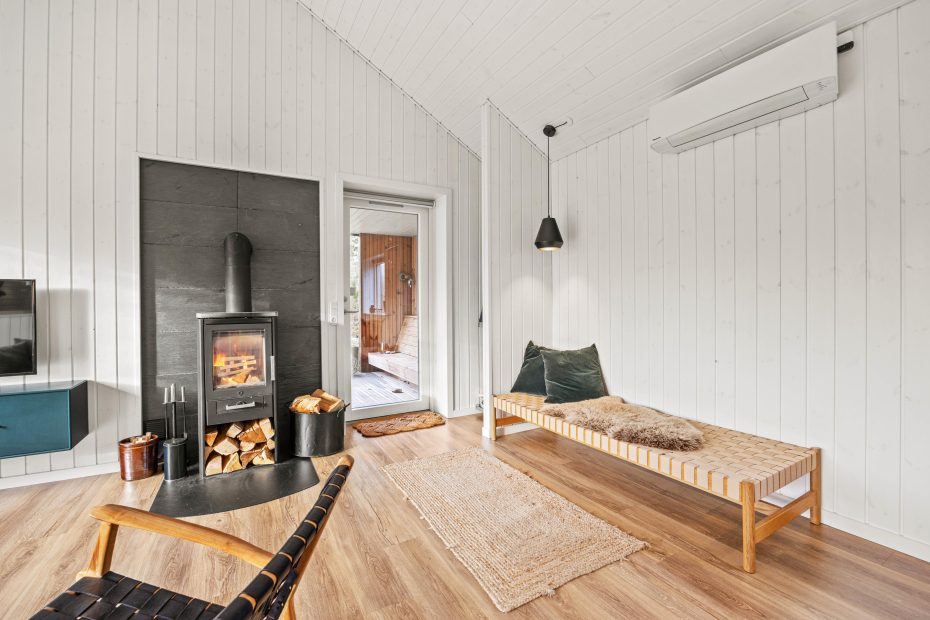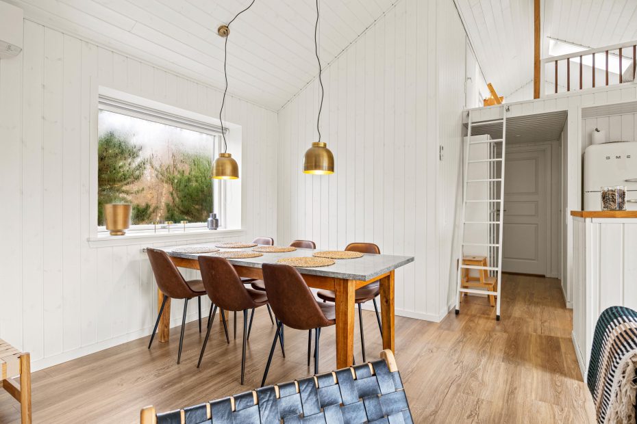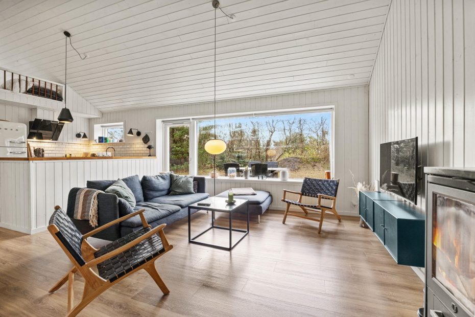 Det lækre feriehus i Henneby fortjener alle sine fem stjerner. Indretningen er moderne og velovervejet, og de hvide vægge og lofter, der går helt op i kip, åbner rummene op og skaber en imødekommende ferieatmosfære.
