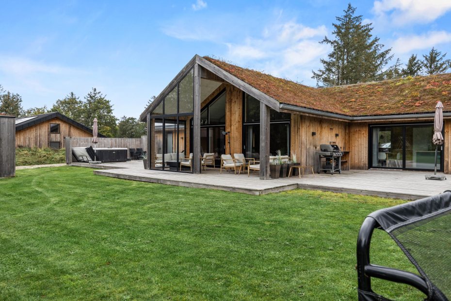 På Strandgodsvej 15 i Henne ligger dette fantastiske sommerhus, som blev opført i 2021, med plads til hele 10 personer og 2 hunde. Den store naturgrund har både udendørsspa, en lækker udesauna, udendørs bruser og udekøkken, mens I indenfor finder et spændende aktivitetsrum. I hele den store feriebolig er der gulvvarme, og der er tilmed en hyggelig hems.
