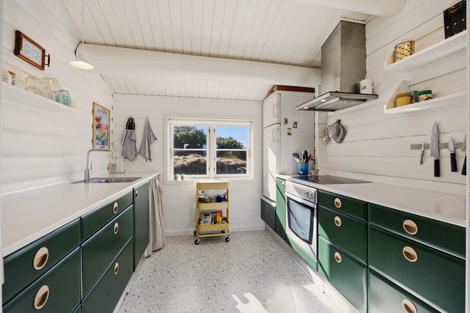 Det er ikke kun beliggenheden, der sætter stemningen. Sommerhusets indre byder på en både personlig og romantisk indretning med masser af fine detaljer, som straks leder tankerne hen på den klassiske sommerhusferie; med flotte retromøbler, synlige loftsbjælker og brændeovn.