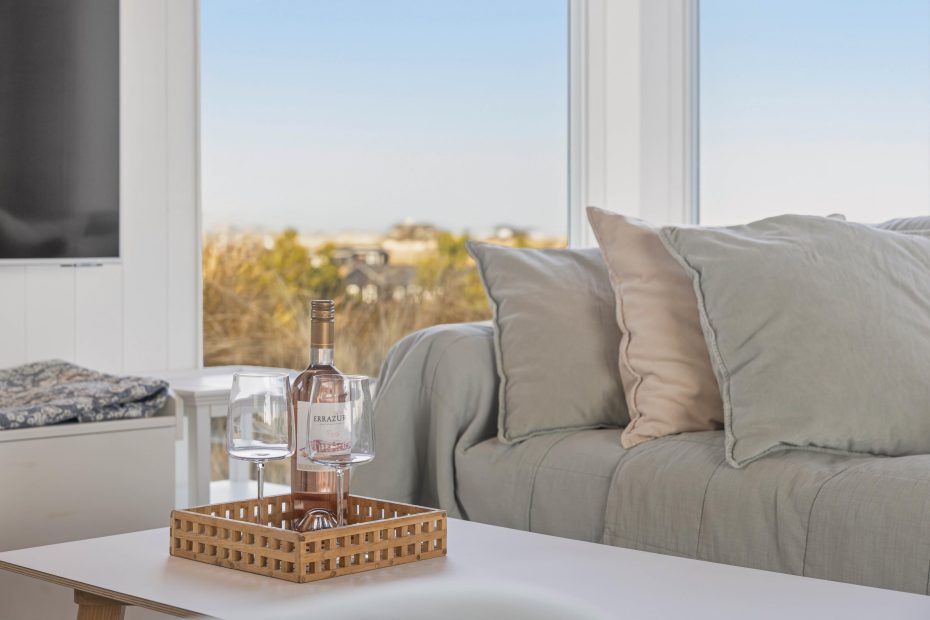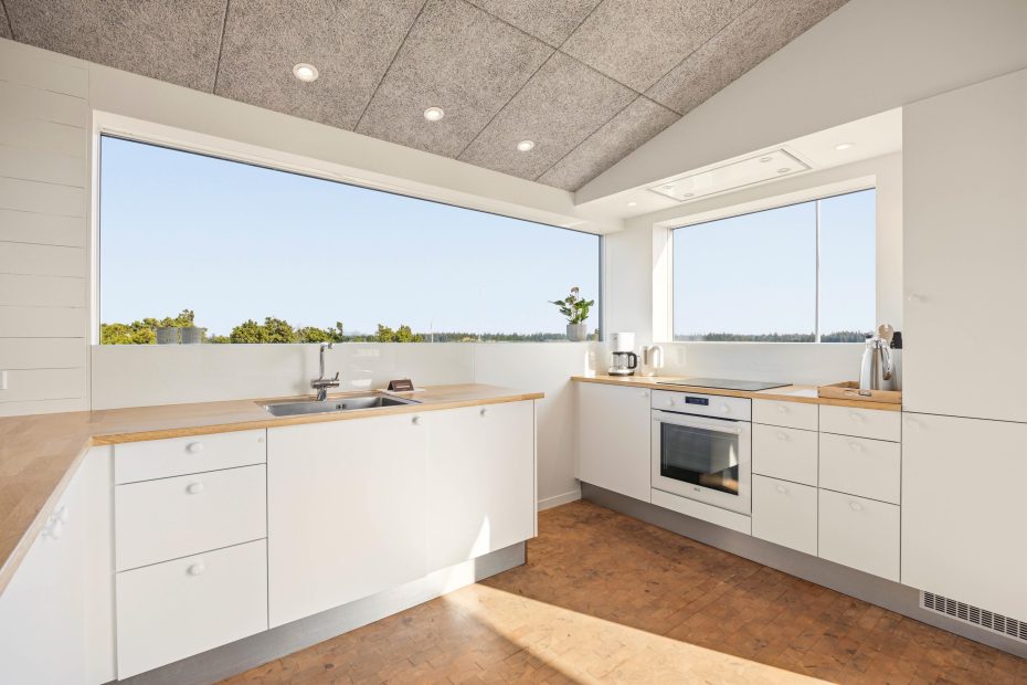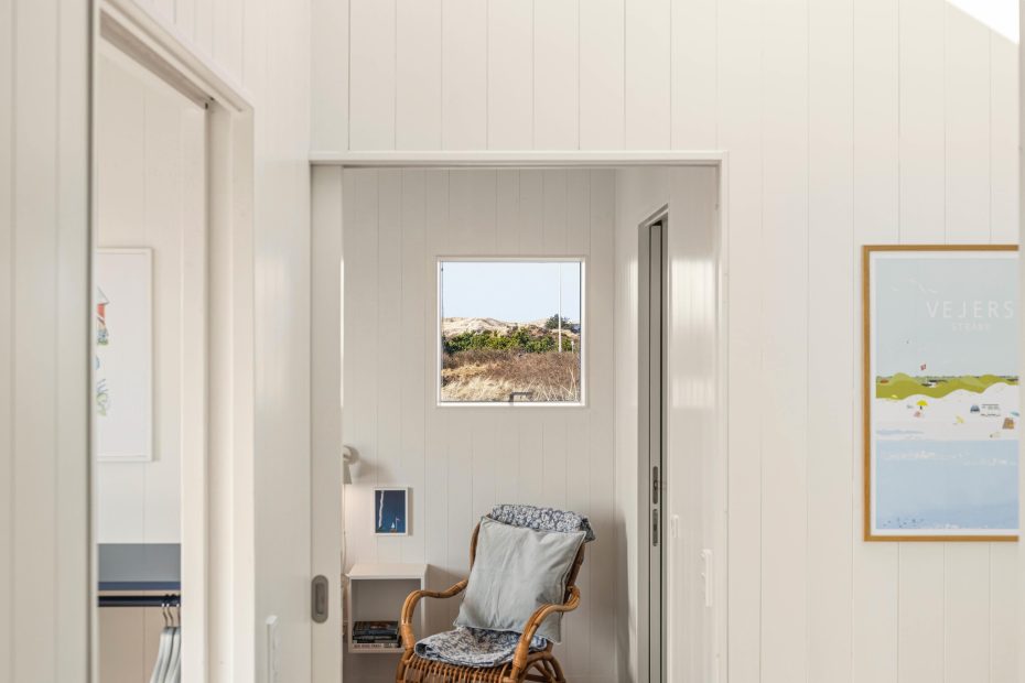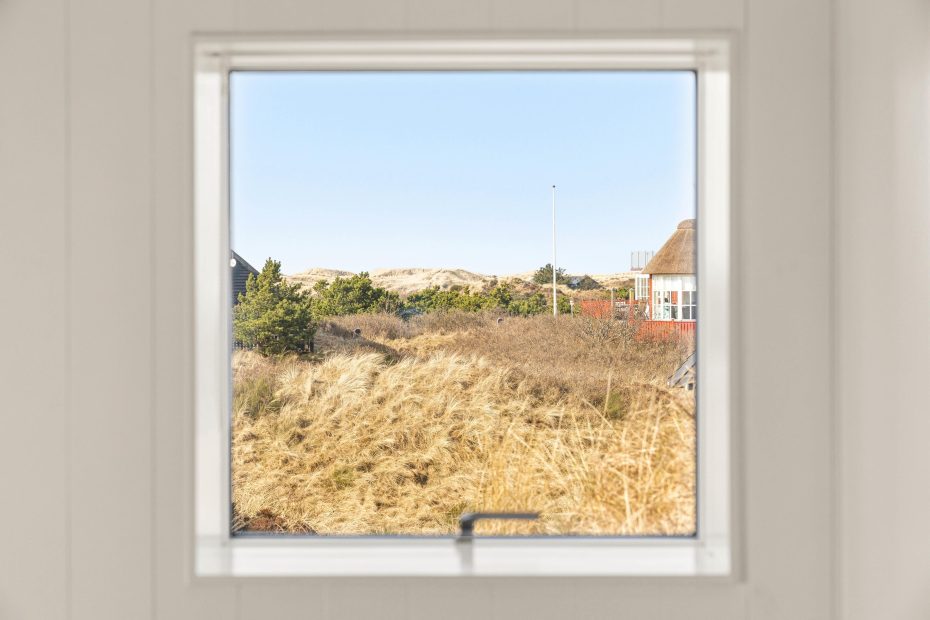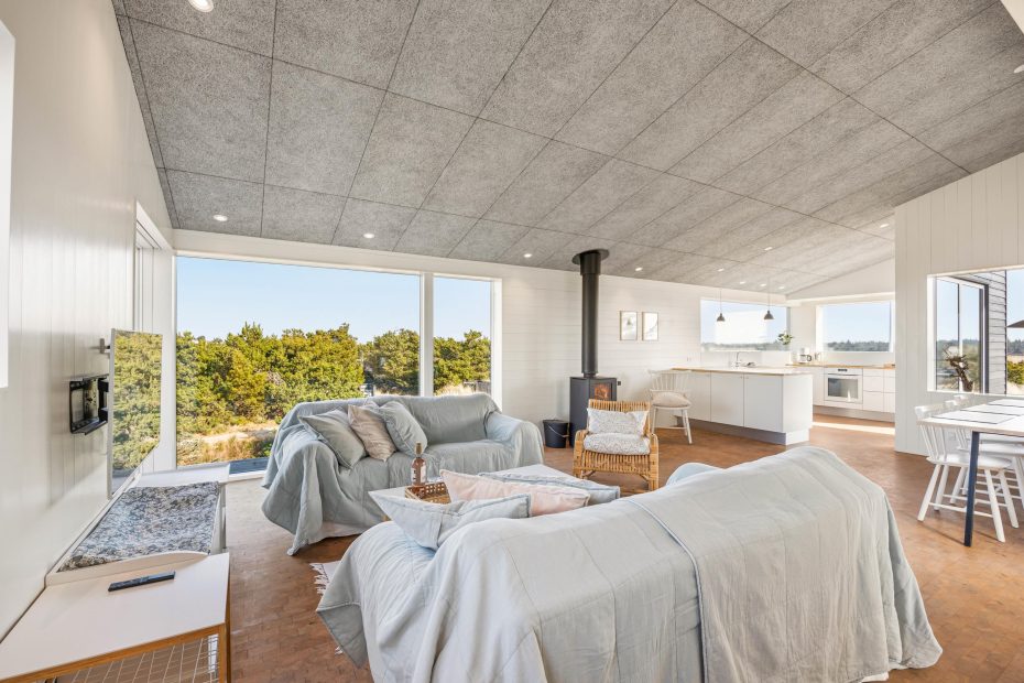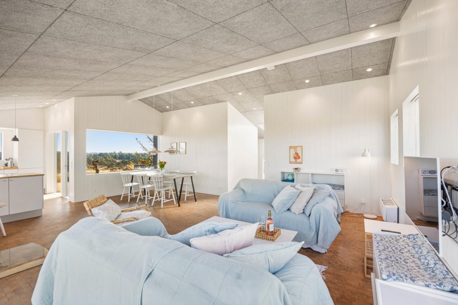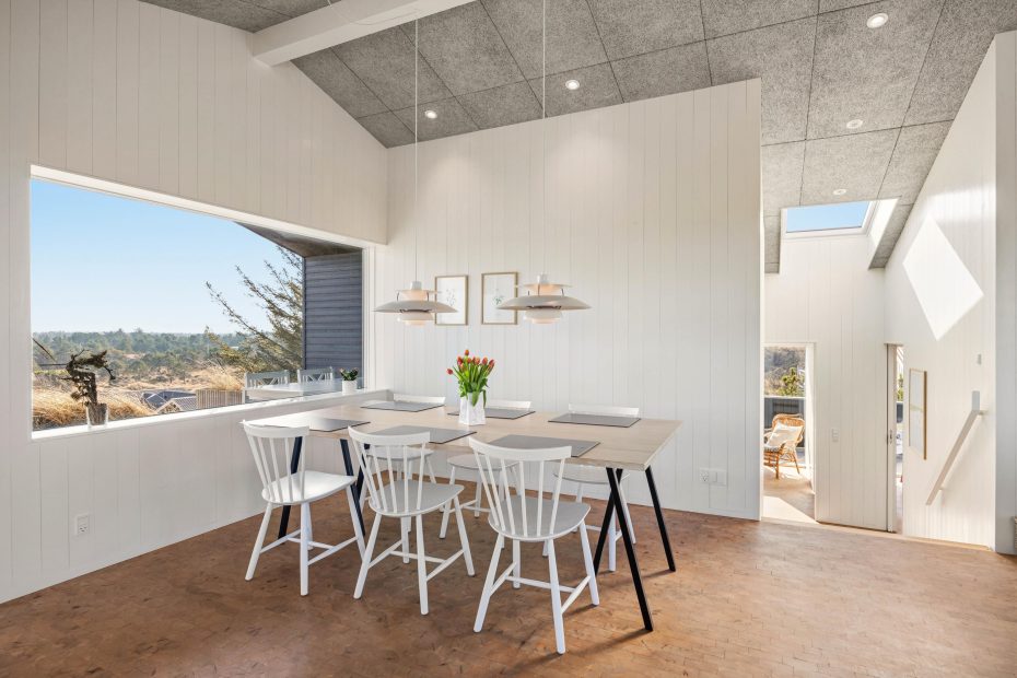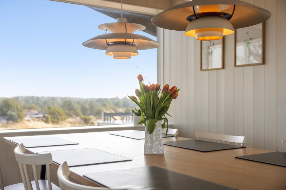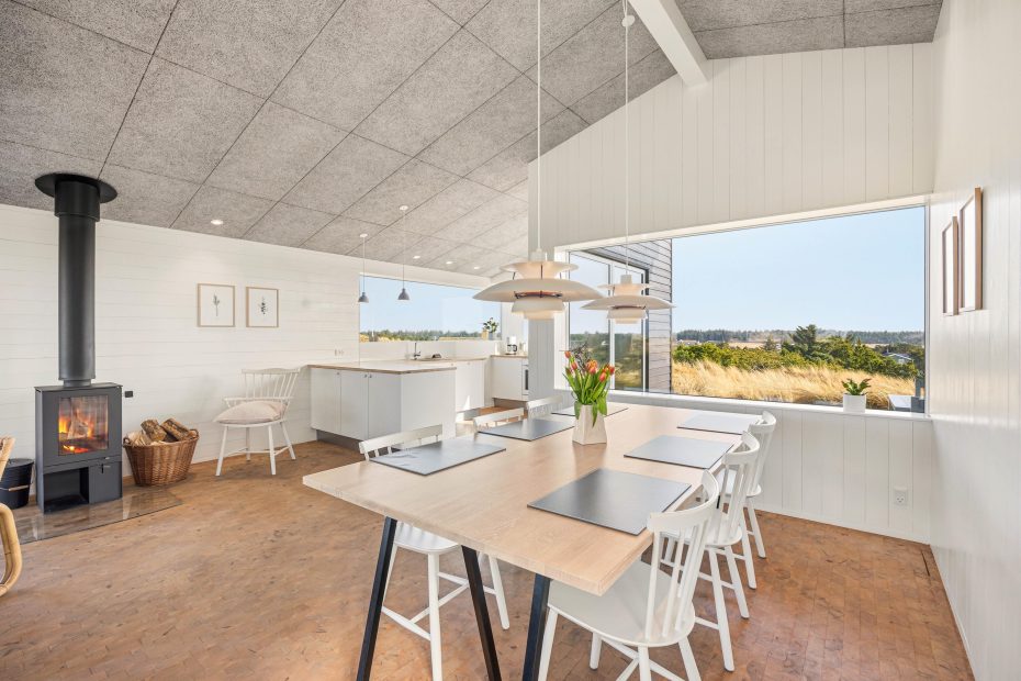 I opholdsrummet samler I jer helt naturligt. Her trækker panoramavinduerne klitternes former tæt på, så I får et smukt panoramablik gennem dagen, mens indretningen holder det moderne og afslappet. Når vinden rusker, tænder I op i brændeovnen og lader varmen brede sig, og på de dage, hvor I bare vil have det nemt, sørger varmepumpen for en behagelig temperatur uden besvær. Om aftenen kan I streame jeres favoritter via Google Chromecast – perfekt til film, musik eller en rolig stund efter en lang dag ude.