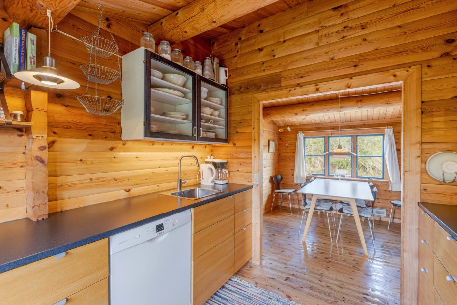 Bjælkehusstemningen fortsætter indenfor i indretningen, hvor de rå og naturfarvede bjælker skaber en varm og hyggelig atmosfære. Huset er indrettet med gode møbler, der forstærker den hjemlige sommerhusstemning.
