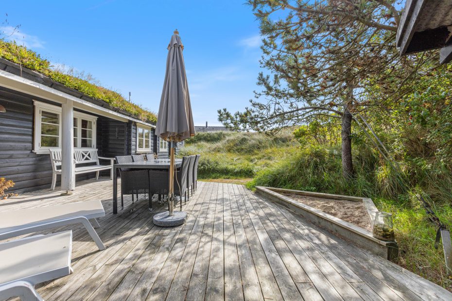 Selvom sommerhuset kun ligger 400 meter fra Vesterhavets bølger, ligger husets terrasser ugeneret og i læ for vinden. Sommerhuset ligger nemlig bag en lille forhøjning i landskabet, som skærmer for vinden.