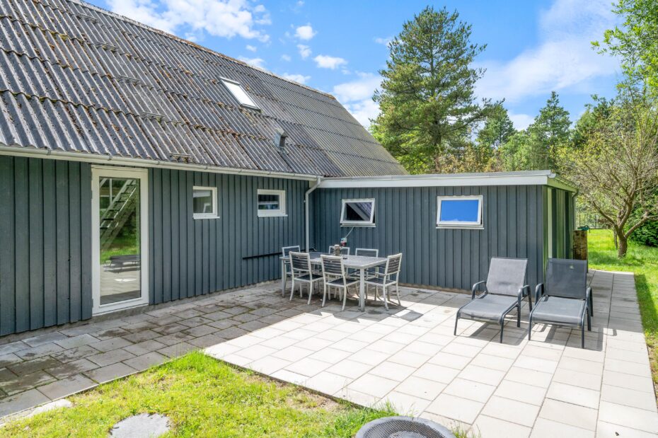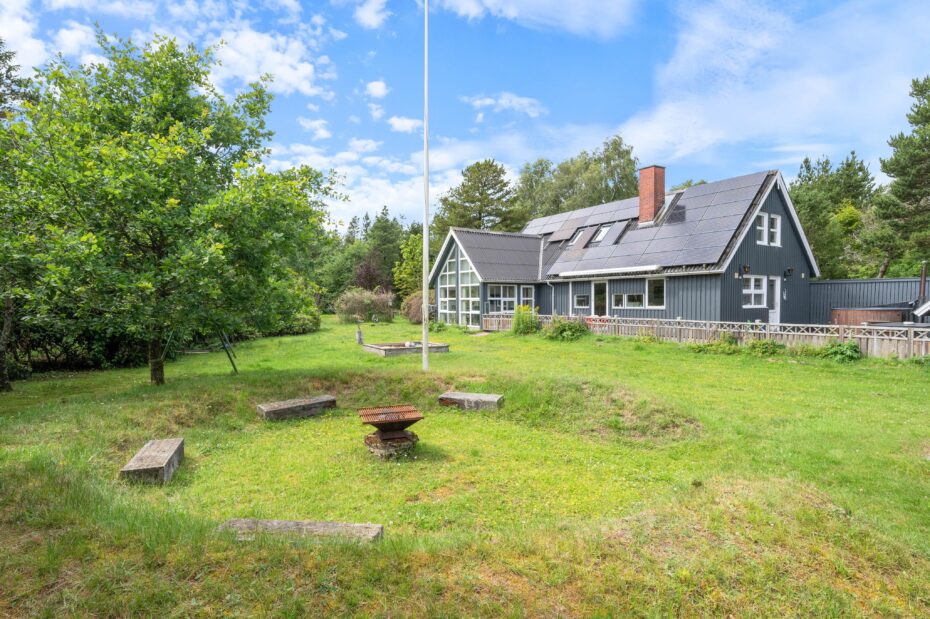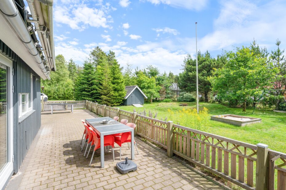 På den åbne terrasse kan I slikke solskin på de komfortable havemøbler. Tag et afslappende bad i vildmarksbadet under stjernehimlen eller tænd op i grillen, og slut dagen af med et lækkert grillmåltid sammen, imens skyggerne bliver lange. Til de små er der sandkasse og gynger. Sammen kan i gå på opdagelse på den 3000 kvm store plænegrund, omkranset af høje træer og med hyggelige pletter at samles på, spille boldspil eller et spil viking.