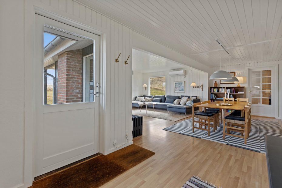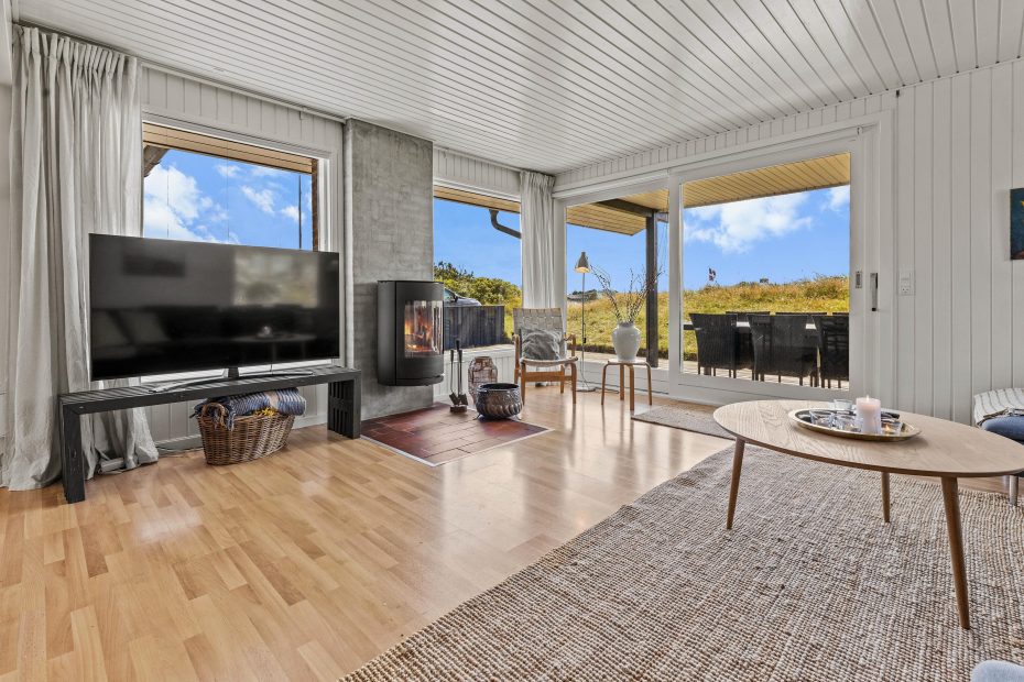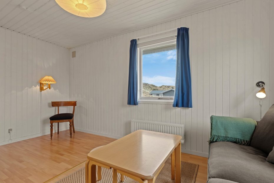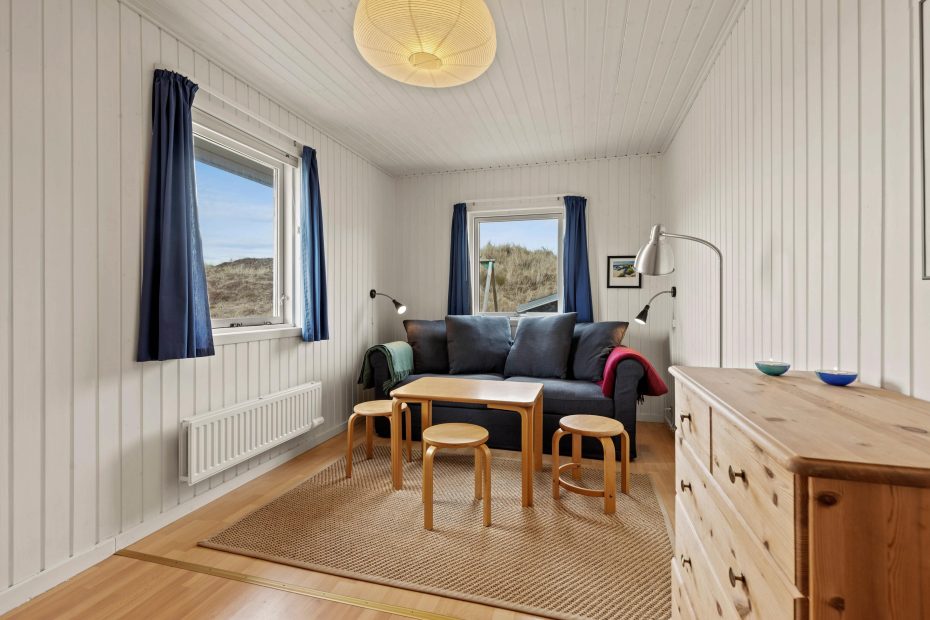 De store vinduespartier i opholdsstuen giver et flot lysindfald og en fantastisk udsigt over klitlandskabet i Grærup. Du kan sætte dig til rette i gyngestolen med en kop te – eventuelt med ild i pejsen – og bare nyde naturen. I opholdsstuen vil I kunne nyde samværet, få mange gode snakke, spille spil eller læse en god bog. Hurtigt vil hverdagens stress forsvinde og den dejlige feriestemning fylde i stedet.