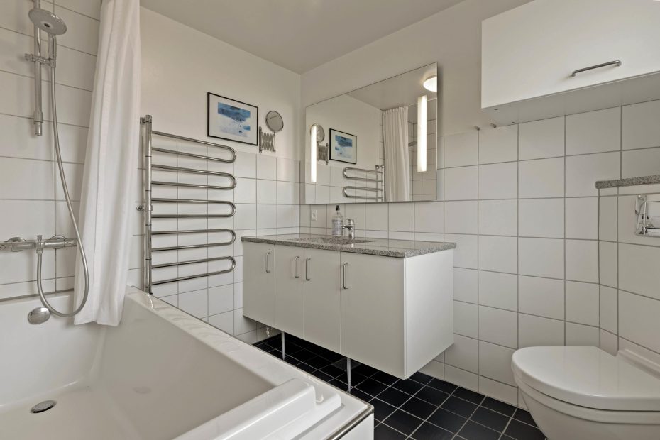 De 2 badeværelser med gulvvarme betyder, at I ikke behøver at stå i kø til morgenbadet. Det ene har badekar, det andet bruser – så der er noget for enhver smag. Sommerhuset opfylder også kravene fra en moderne familie med f.eks. vaskemaskine og tørretumbler, opvaskemaskine og en energibesparende varmepumpe.