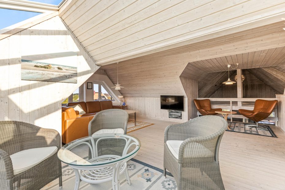 Opholdsstuen befinder sig på første sal, med åbent kig ned til alrummet. Her har I et storslået lysindfald fra det store vinduesparti, og de mange siddepladser giver jer mulighed for at samles her til hyggeligt samvær.