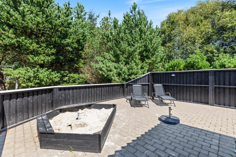 Den delvist overdækkede og indhegnede terrasse når I gennem stuen. Terrassen omgiver hele huset og er godt møbleret, så I sammen kan grille, spise god mad og dase i solen. Her er I omgivet af en stor grund med grønt græs, og der er tilmed en gynge og en sandkasse til børnene. Carporten sørger også for, at bilen står godt beskyttet.