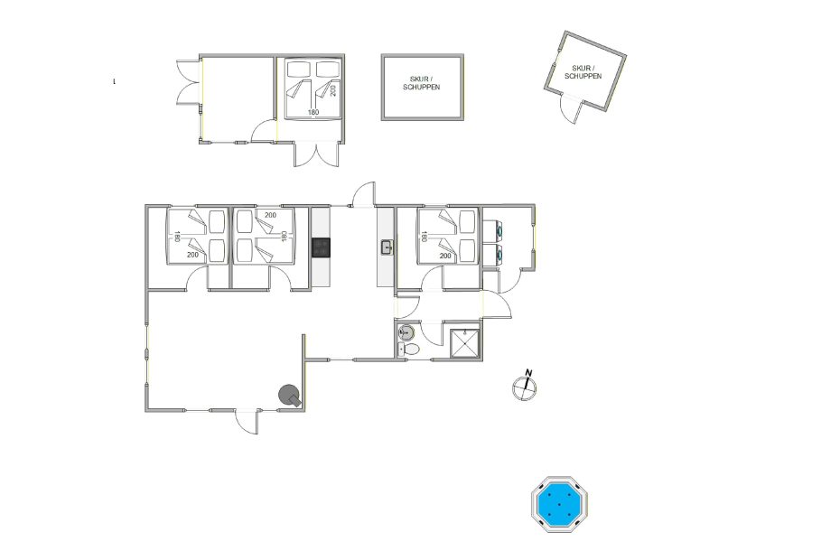 Sommerhusets udendørsfaciliteter bidrager til den afslappende atmosfære. Udespaen byder på varme bobler under åben himmel, hvor I kan nyde udsigten til himlen – om aftenen måske stjernehimlen – og lade kroppen slappe af efter en dag ved stranden eller på ture i naturen. Udesaunaen giver en varm og rolig oplevelse, hvor I kan få varmen og samtidig få et pusterum. Udebruseren er praktisk til at skylle sandet af efter stranden og kan benyttes fra 1. april til 31. oktober.