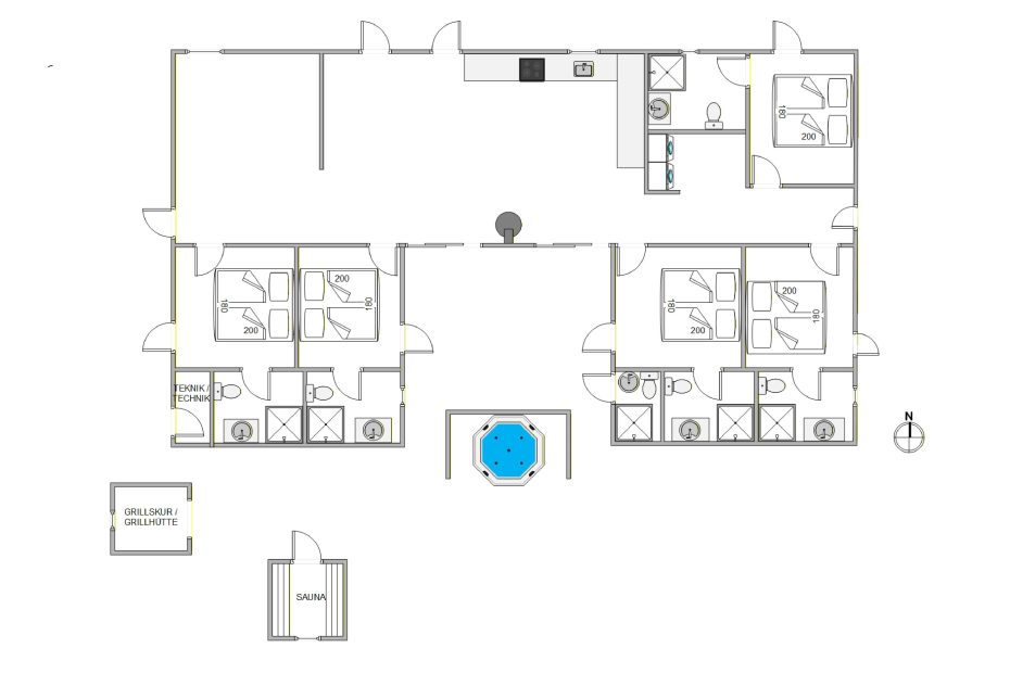Sommerhuset er fordelt på 5 soverum, hver med dobbeltseng og sit eget tilknyttede badeværelse. Fra alle soveværelserne er der også direkte udgang til den store, skønne træterrasse. På terrassen finder I sommerhusets hightlights i form af spabad, udesanua og en fantastisk grillhytte.