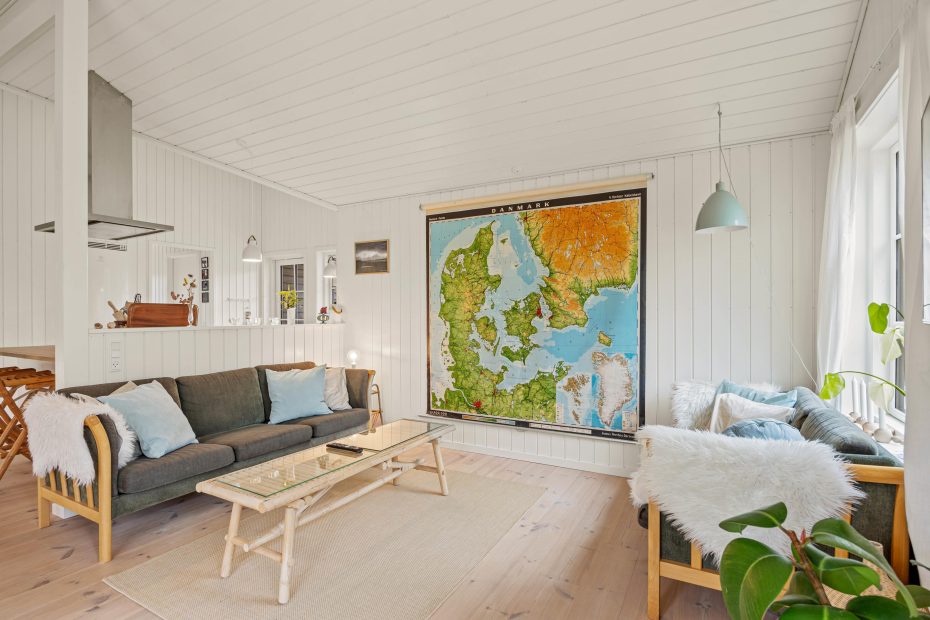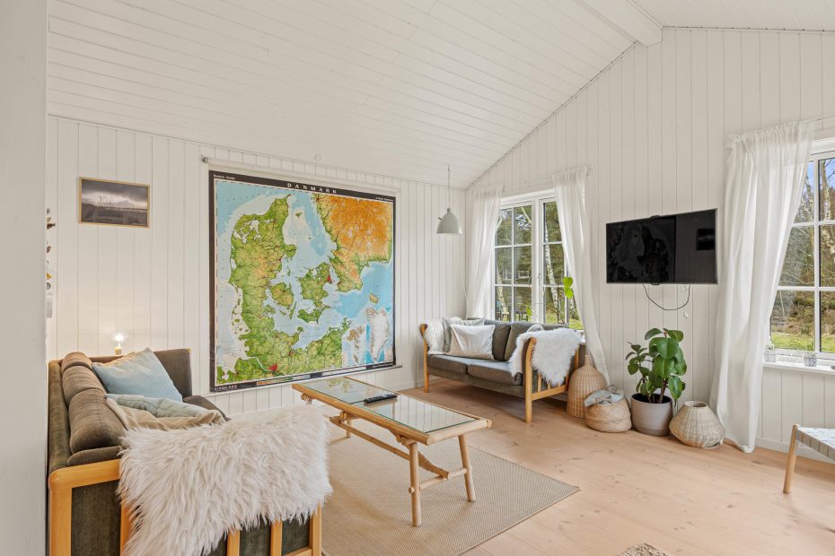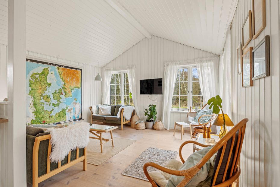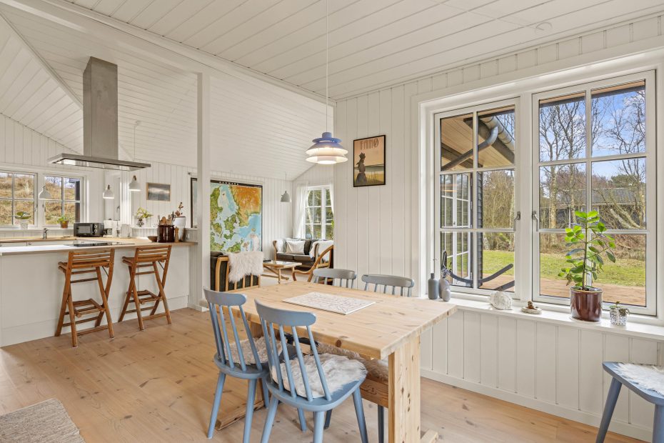 I dette skønne træhus på Hanevej 10 er der hyggekroge overalt. Der er tre soveværelser 1 med dobbeltseng to med enkeltsenge, alt er indrettet i en lys og let nordisk stil med blandt andet bemalede karlekammerskabe, kommoder og stole i tidens glade farver.