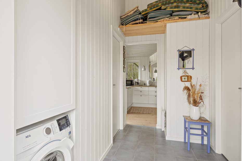 I det moderne køkken er der induktionskomfur og ovn, der er en separat fryser, og på badeværelset er der dejligt med gulvvarme. Hust oser af charme overalt i indretningen, der er ikke sparet på hyggen i form af grønne planter og fine nips ting og rigtig mange bløde puder og skind.
