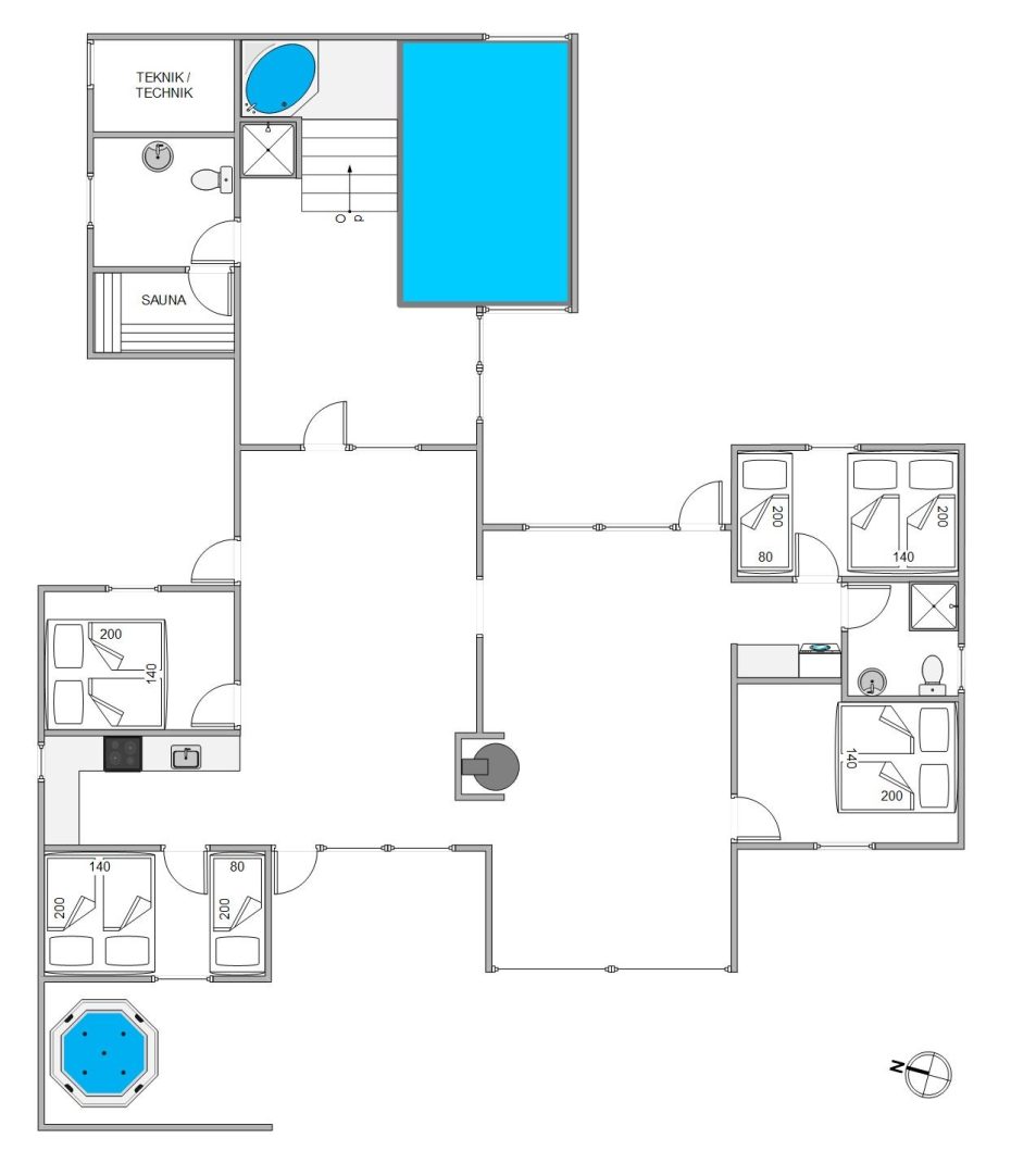 Planløsningen i sommerhuset byder derudover på et badeværelse, et toilet ved poolrummet, bruser i pool området og fire hyggelige soveværelser. Alle soveværelser er udstyret med en dobbeltseng, 140×200, og på to af dem finder I også en køjeseng, 80×200. Under jeres ophold har I også vaskemaskine og tørretumbler til rådighed.