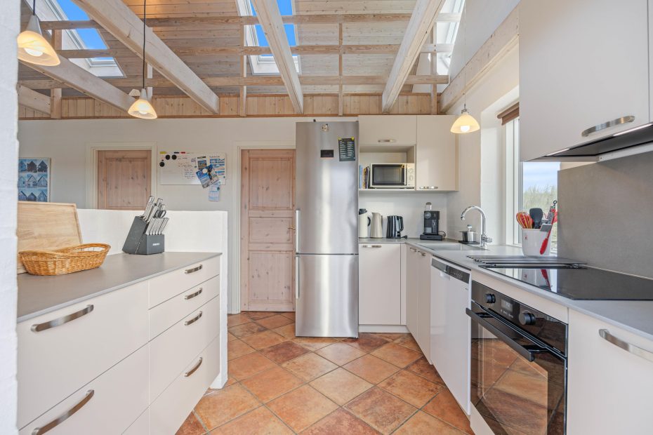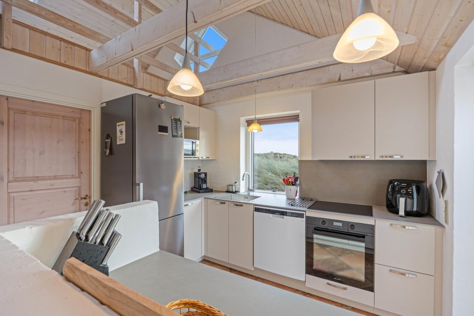 I det lyse og venligt indrettede opholdsrum i sommerhuset kan man kun føle sig godt tilpas. Det lyse træ, loftsbjælkerne og de høje lofter skaber en fantastisk atmosfære. Med vinduespartiet mod Vesterhavet kan I nyde en enestående udsigt over klitlandskabet. Uanset om I sidder i sofaen, ser film sammen eller spiser morgenmad ved spisebordet – udsigten er et ægte højdepunkt.