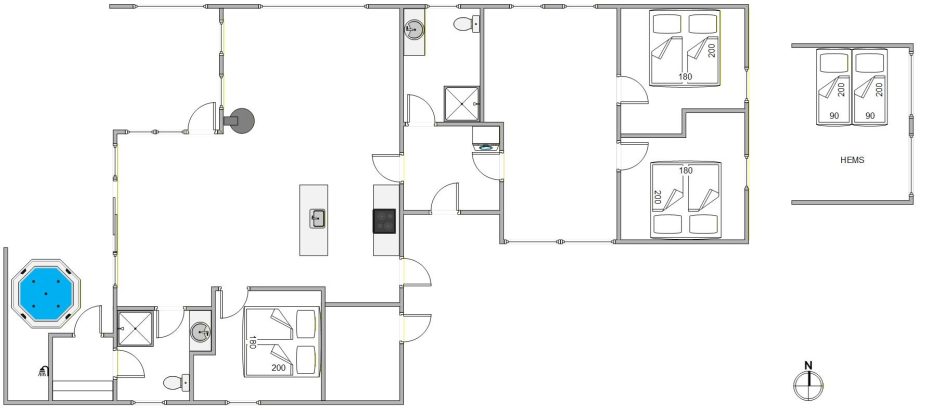 Der er 3 store værelser med dobbeltsenge og 2 badeværelser, hvoraf det ene har adgang til sauna samt udgang til den store terrasse med udespaen mod vest. Ligeledes findes en dejlig stor hems med 2 soverpladser. Der er tænkt på hver en detalje igennem hele feriehuset og ved behov kan i tænde for de energibesparende varmepumper.