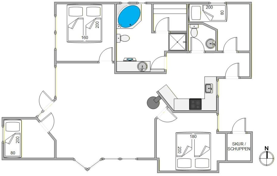 Det ekstra gæstetoilet gør, at I ikke behøver at stå i kø til tandbørstningen. De hyggelige soveværelser er opdelt i 2 værelser med dobbeltsenge og 2 værelser med 1 enkeltseng i hver. Her kan du slappe af og blive udhvilet til næste feriedag.