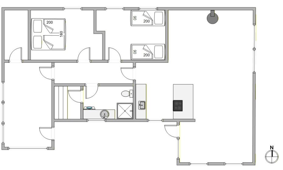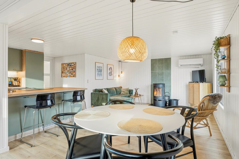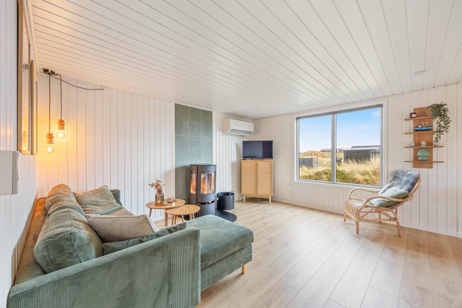 Feriehusets samlingspunkt er stuen, som ligger i åben forbindelse til køkken og spiseplads. I stuen er der en brændeovn, som både spreder varme og en ekstra hyggelig feriestemning på en regnvejrsdag. Sommerhuset har også en udestue, hvorfra I har en skøn udsigt til det naturskønne område.