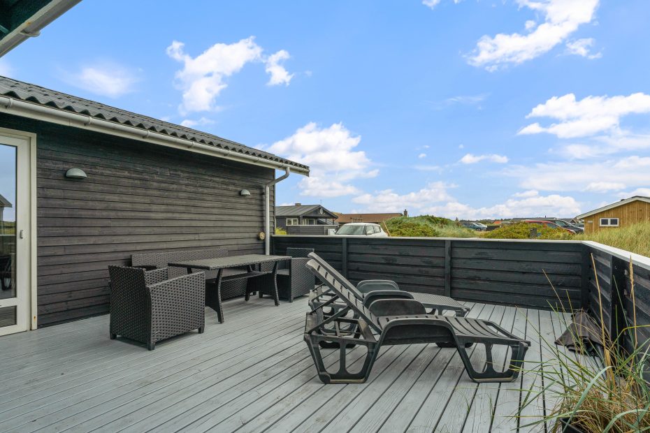 Den lukkede terrasse ved sommerhuset er ideel til småbørnsfamilier, eller hvis du har hund med. Her kan I slappe af i de komfortable liggestole eller hygge jer sammen i havemøblerne. Der er gode kroge, så I kan finde skygge eller læ, når I har brug for det. Med kun 200 meter til Vesterhavet, må I naturligvis også besøge den kilometerlange sandstrand og måske dyppe tæerne i det brusende Vesterhav.