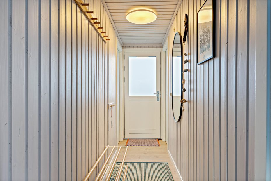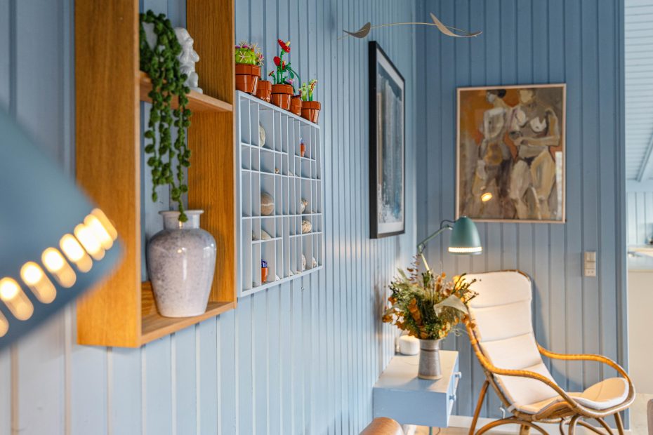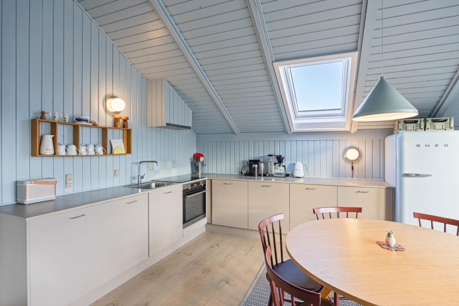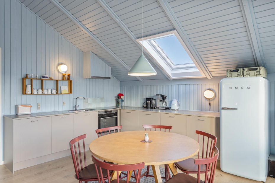 Feriehuset er velholdt og har loft til kip med ovenlysvinduer, hvilket gør det lyst og indbydende. Indretningen er charmerende med en gennemgående lyseblå farve i sommerhuset. Med 3 soveværelser er der plads til 6 personer, hvoraf 2 af værelserne er indrettet med dobbeltseng. På det sidste værelse finder du en køjeseng – perfekt til børnene.