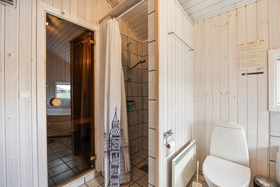 Der er et stort badeværelse, hvor der er gulvvarme, bruseniche, vaskemaskine, tørretumbler, en hjørnespa og en sauna. Derudover er der også et gæstetoilet med gulvvarme.
