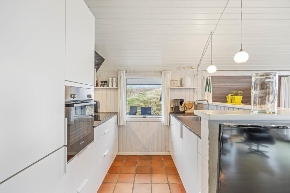 Terrassen er afskærmet og delvist overdækket, så I næsten altid kan sidde ude. Og på de hyggelige grillaftener kan I tænde op i den åbne pejs, som er bygget ind i skorstenen, og på den måde holde varmen efter solen er gået ned bag klitterne.